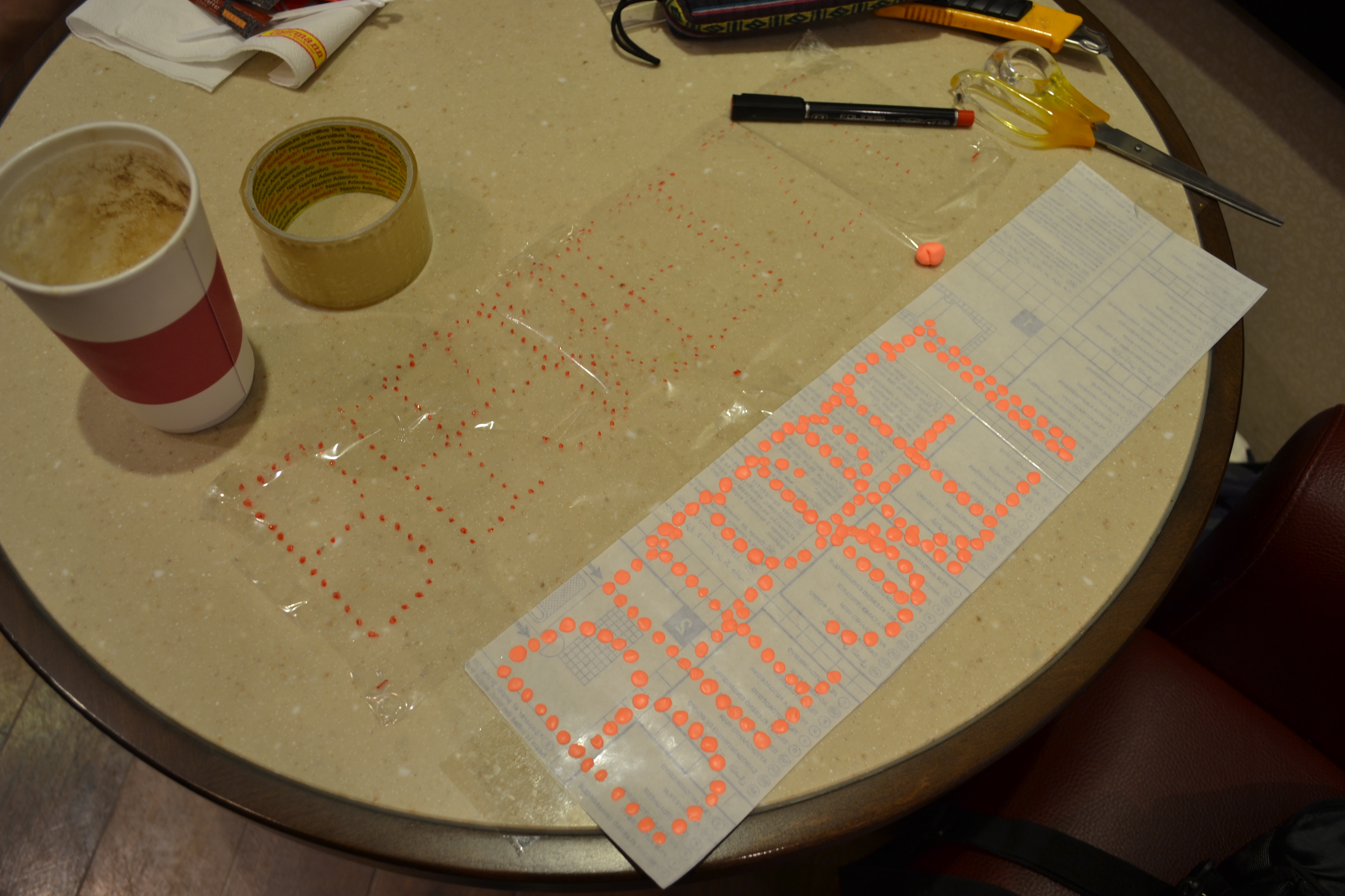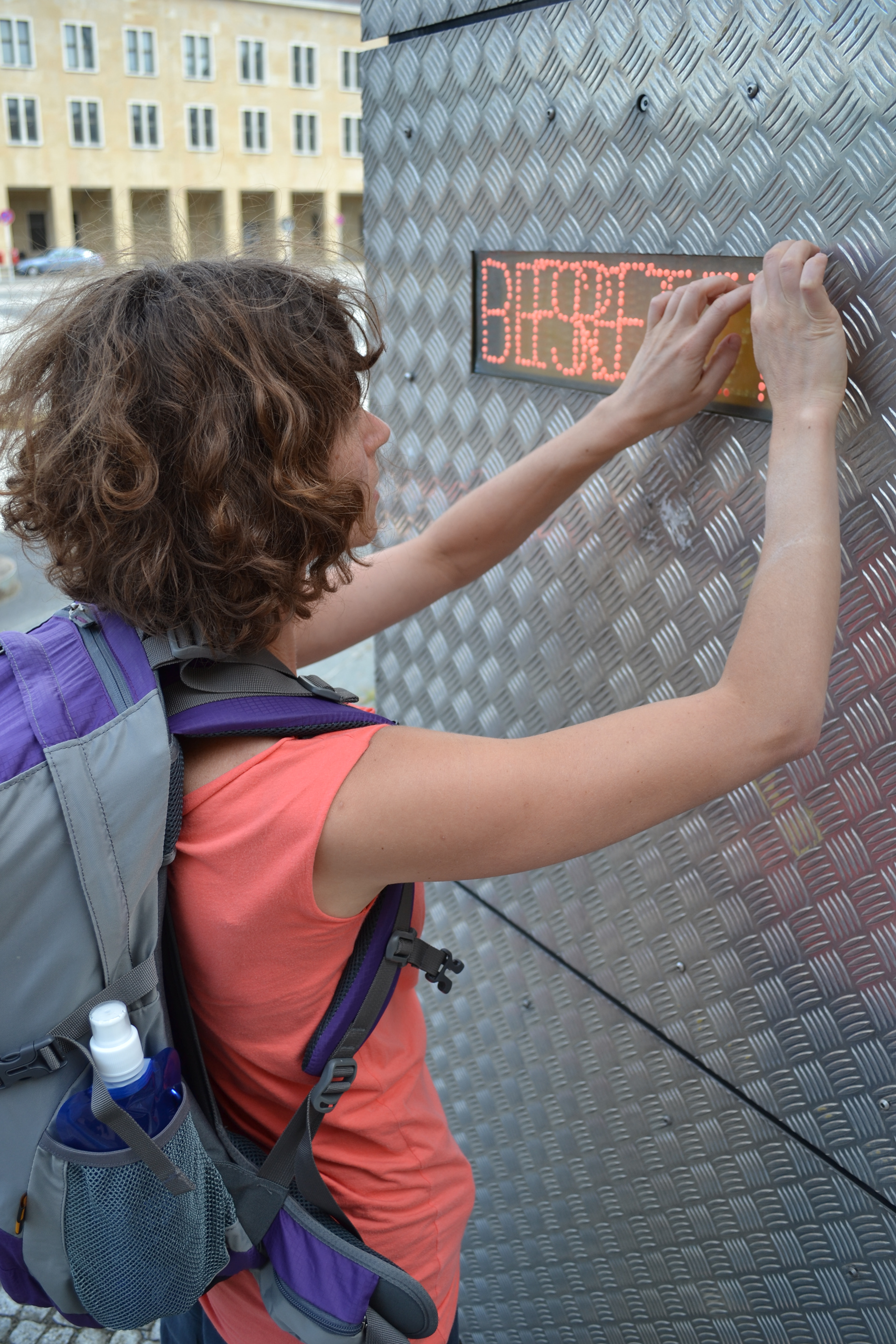 „Frei / Besetzt” zaczyna „świecić” po wyklejeniu wszystkich miejsc na powierzchni szyby, odpowiadających diodom, przy pomocy fluorescencyjnej gumy do żucia. Tak jak w poprzednich działaniach, których celem jest zawsze próba wydobywania znaczeń, aby do nich dotrzeć, potrzebny jest mi jakiś katalizator. Może to być mały akt wandalizmu w miejscu publicznym i na publicznym mieniu. Tym razem będzie to „zniszczenie” (zabytkowej już) tablicy informacyjnej parkingu lotniska Tempelhof przez oblepienie jej gumą do żucia. Gumę do żucia znajdziemy powdeptywaną w chodniki, schody, posadzki, poprzylepianą do ławek i innych obiektów. Banalna rzecz, nie rzucająca się w oczy część przestrzeni miasta jest śladem ludzi w nim żyjących. Jednak doklejanie jej na pozostałościach muru berlińskiego staje się znaczącym gestem — gestem symbolizującym dołączenie do pewnej wspólnoty będącej w konkretnej sytuacji politycznej. Jest manifestacją uczestnictwa w tym miejscu, czasie i kontekście.